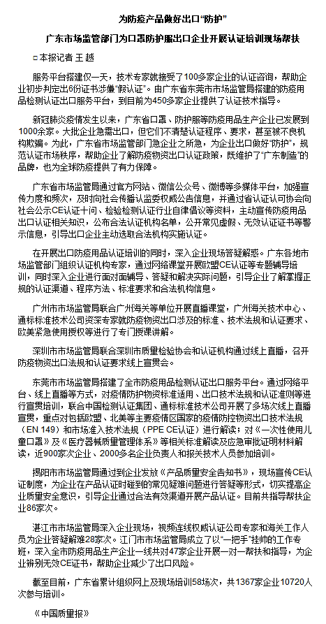 根據(jù)《中國質(zhì)量報》2020年4月29日的報道:“為防疫產(chǎn)品做好出口“防護(hù)”廣東市場監(jiān)管部門為口罩防護(hù)服出口企業(yè)開展認(rèn)證培訓(xùn)現(xiàn)場幫扶”,4月初開始廣東省政府及廣東各質(zhì)量監(jiān)督部門,市場監(jiān)督部門,共同搭建認(rèn)證服務(wù)平臺,輔助企業(yè)做好認(rèn)證技術(shù)指導(dǎo)。由廣東省東莞市市場監(jiān)管局搭建的防疫用品檢測認(rèn)證出口服務(wù)平臺,為450多家企業(yè)提供了認(rèn)證技術(shù)指導(dǎo)。