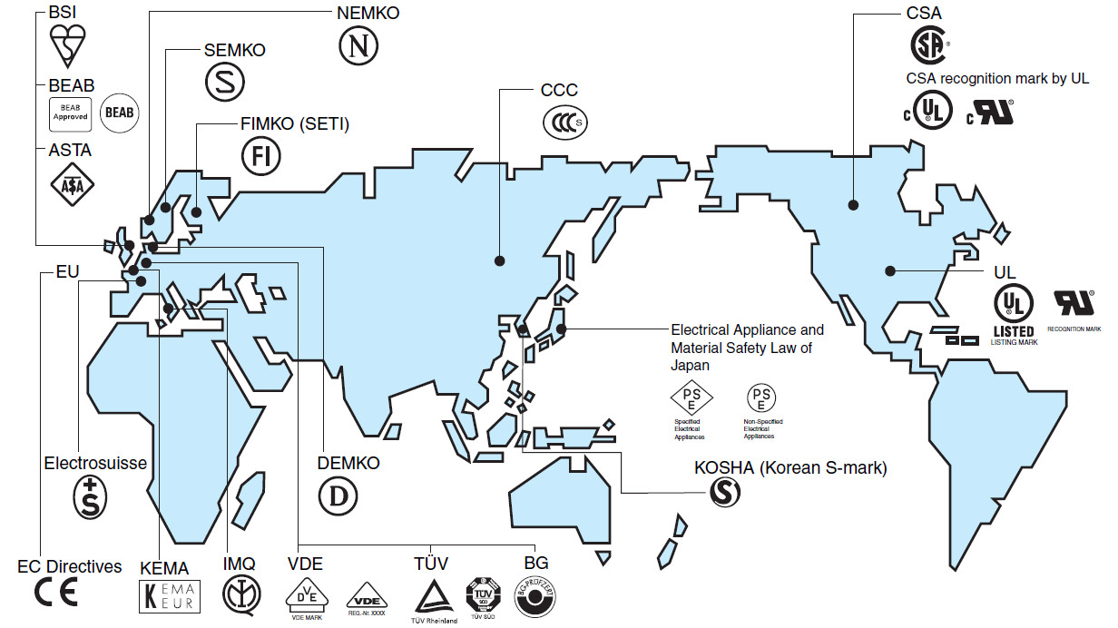 中國的3C認(rèn)證,其實(shí)和歐洲的CE認(rèn)證,北美的UL認(rèn)證,CSA認(rèn)證等等類似,下圖是一張全球不同國家強(qiáng)制認(rèn)證及其代表性標(biāo)識(shí)的分布圖。