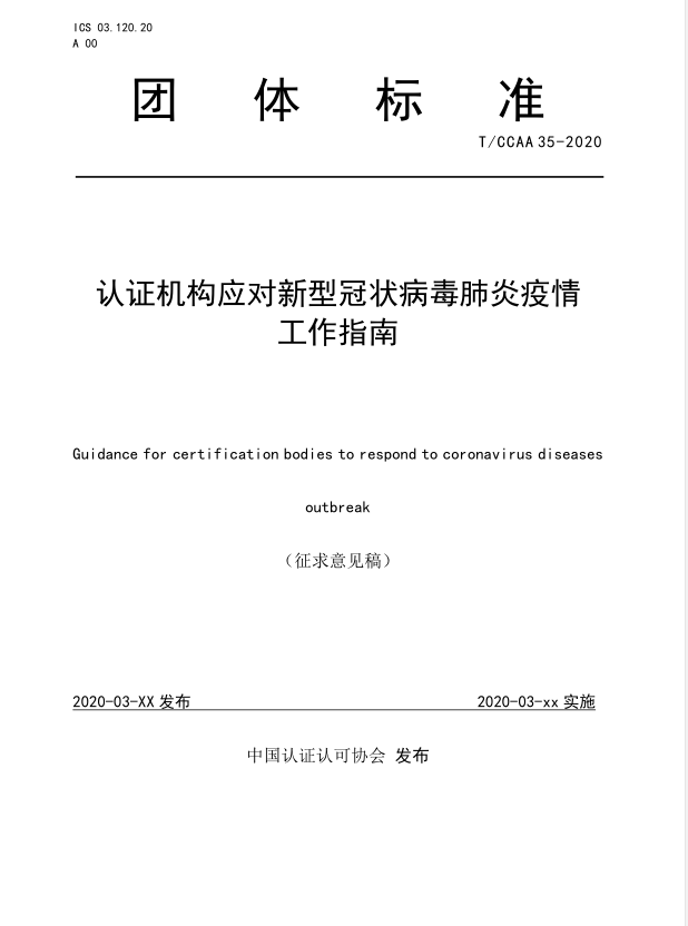 呼之欲出的《認證機構(gòu)應對新型冠狀病毒肺炎疫情工作指南》的團體標準,即將出來。里面詳細的規(guī)定了“疫情防控期間認證機構(gòu)運行管理和疫情防控期間認證審核的策劃與安排”。詳見以下附件: